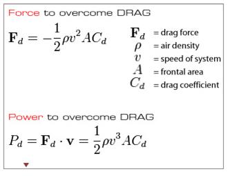 Kuna Võimsus (Pd) võrdub Jõud x liikumiskiirus (Fd x v) peab võimsus ületama õhutakistuse kasvu kuubis (^3) kiiruse suhtes. Ehk siis, kui kasvatada kiirus kahekordseks on vaja kaheksa korda rohkem jõudu, kuna teete neli korda rohkem tööd poole ajaga.