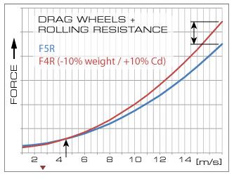 Kui nüüd võrdleme kahte erinevat jooksu (F4R ja F5R), siis näeme (v.t joonis 3), et teatud kiirusest alates tekkib punkt, kus jooksude kaal omab väiksemat tähtsust, kui selle aerodünaamilised omadused. Selle näite puhul kiirusel ~4.5m/s (16.2km/h).