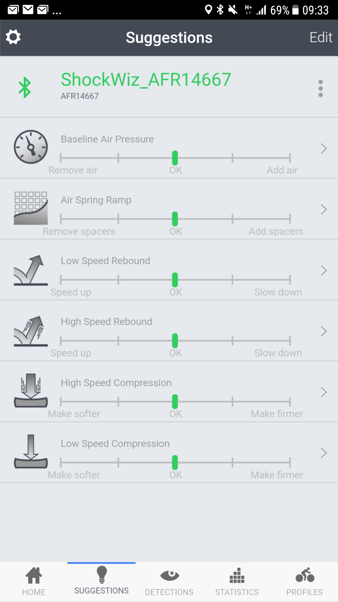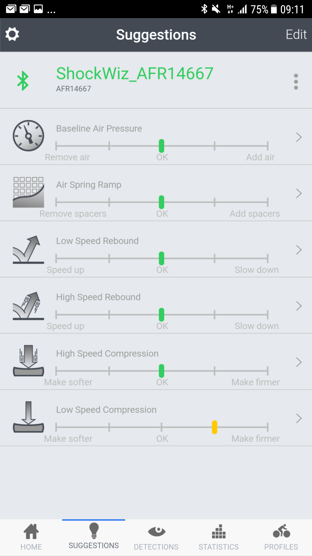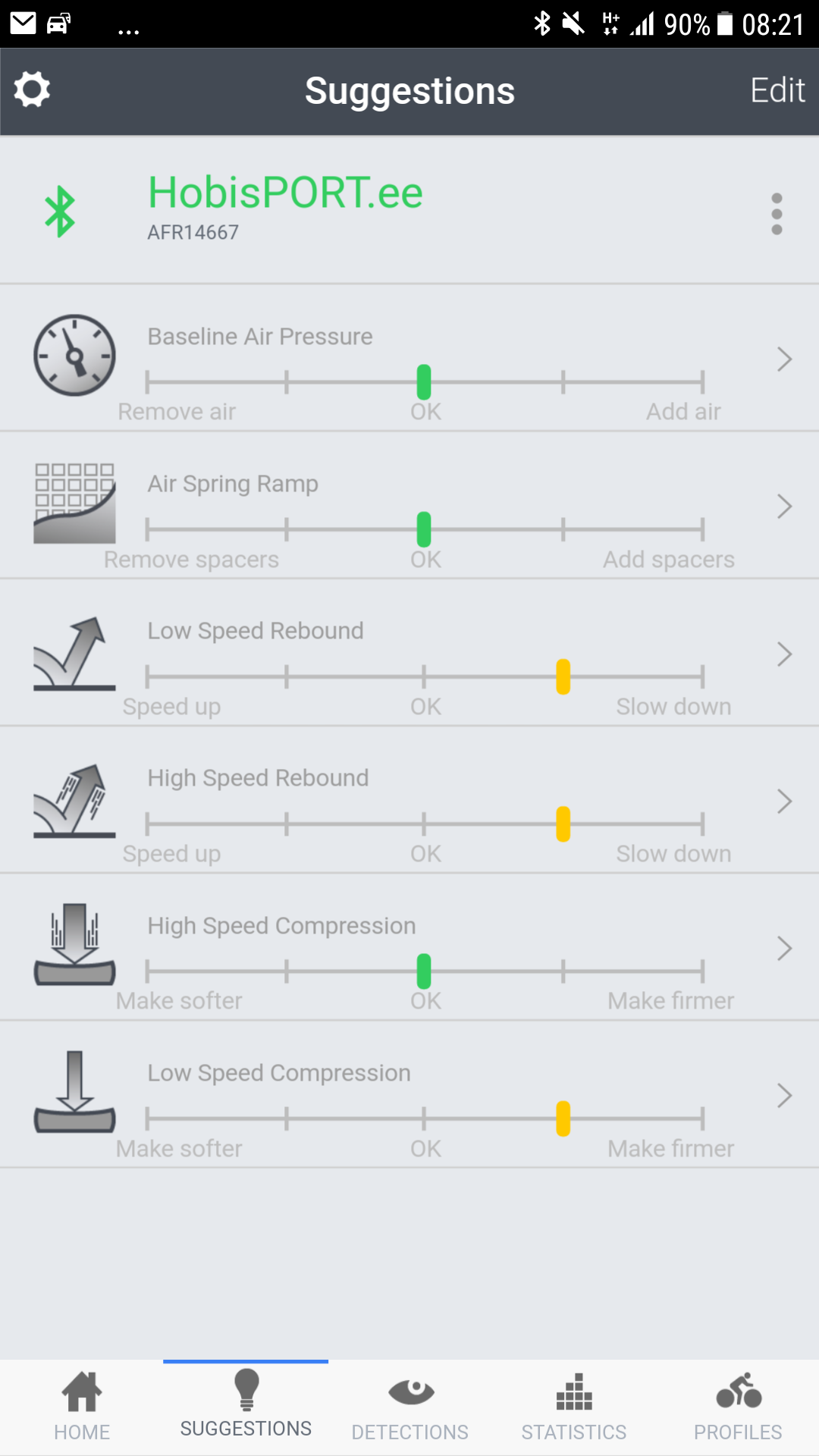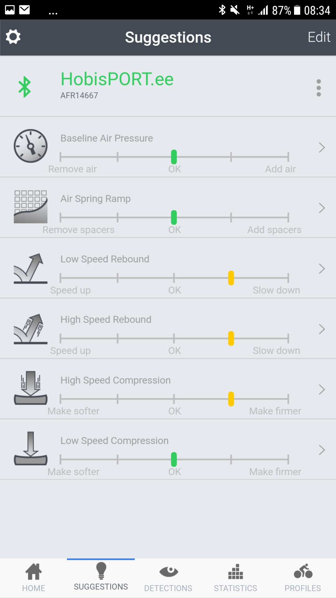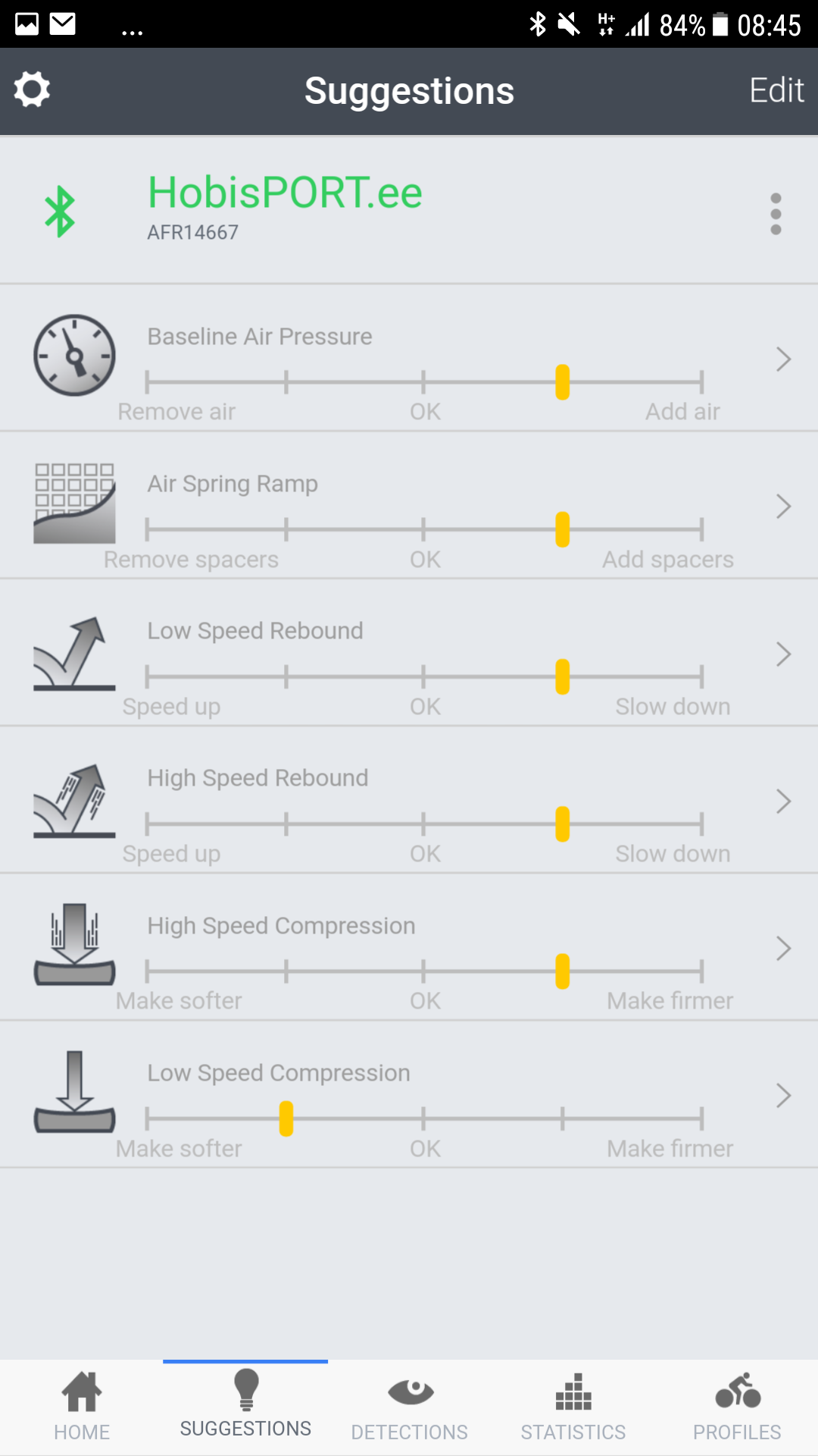 Seejärel käivitasin äpist kalibreerimise ja järgisin seda samm sammult (see sisaldab endast amordi rõhust tühjaks laaskmist, kogu amordi käigu SW-le ettenäitamist ja ühetkoma teist veel. Kõik lihtsalt äpis seletatud ja teostatav). Äpist saad valida mis stiilis vedrustust sa soovid saada. Mina valisin "Balanced" (saab ka enda custom teemat teha, või valida "Agressive", "Efficent" jne).