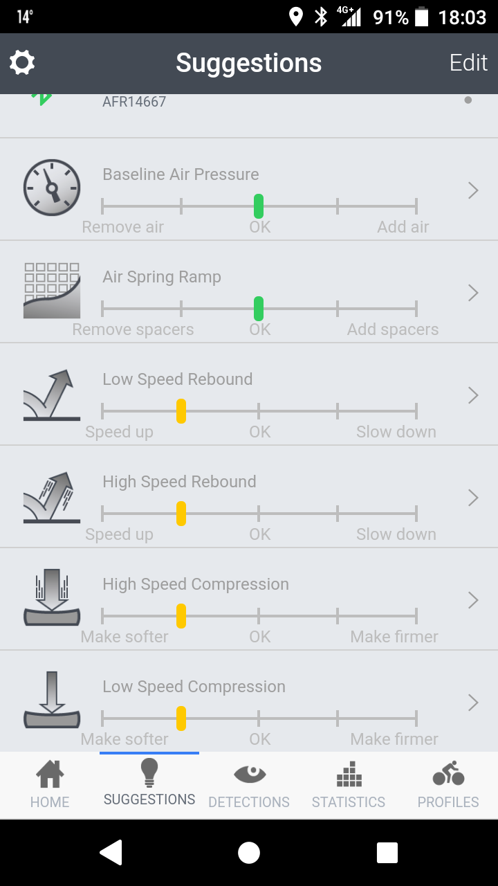 "Kollane" tähendab 1-2 klikki. Keerasin siis tagasilööki 2 klikki ja aeglast kompressiooni ka 2 klikki soovitud suunas, ning alustasin uut sessiooni. Samuti soovitab äpp ekrani all osas fokuseerida mingile teatud maastiku elemendile, mille kohta tal infot napib. Näiteks "Ride small bumps - rockgarden or roots" jne.
